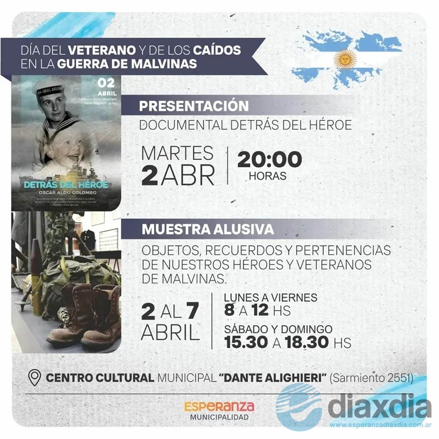 Por un lado, se realizará la proyección del documental audiovisual “Detrás del Héroe”, la historia de Oscar Colombo, excombatiente de Malvinas realizado por Martina Colombo y Ariel Pascal. La misma será el 2 de abril, a las 20 horas, en la sala del Centro Cultural Municipal “Dante Alighieri”.