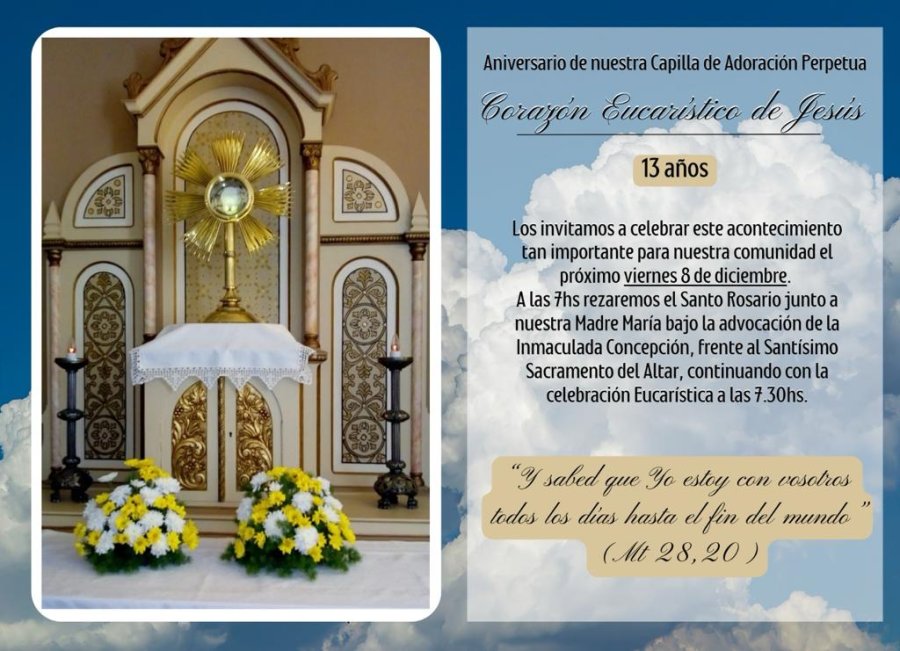 Además el viernes desde las 7 rezarán el Santo Rosario y luego la Santa Misa donde conmemorarán los 13 años de Adoración Permanente en la Basílica Natividad.