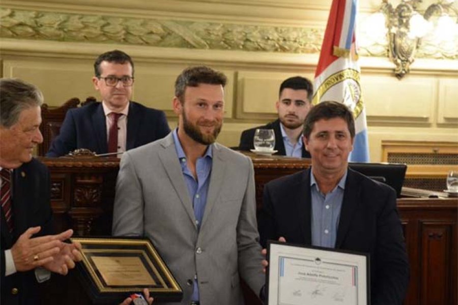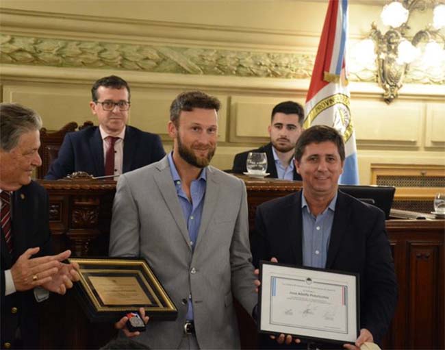 El deportista recibió de manos del senador Pirola y del vicegobernador Fascendini, un diploma, una plaqueta y distintos obsequios.