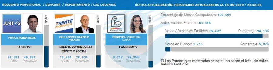 Rubén Pirola fue reelecto senador por Las Colonias con la contundencia de obtener el 50% de los votos emitidos en las 37 localidades del departamento.
