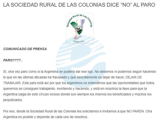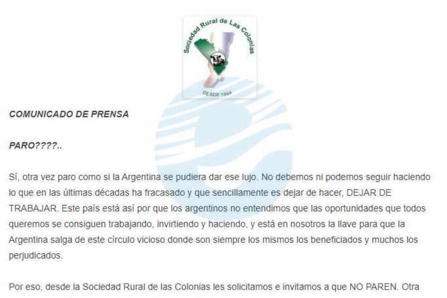 Por eso, desde la Sociedad Rural de las Colonias les solicitamos e invitamos a que NO PAREN.