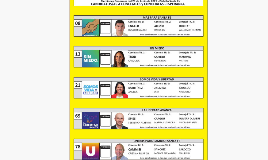 El Tribunal Electoral difundió el diseño de las boletas que se utilizarán en nuestra ciudad que tendrá al Frente Más para Santa Fe en primer lugar, seguido del Frente Sin Miedo, luego Somos Vida y Libertad, abajo La Libertad Avanza y finalmente el Frente Unidos para Cambiar Santa Fe, tal el orden sorteado en el inicio del proceso.