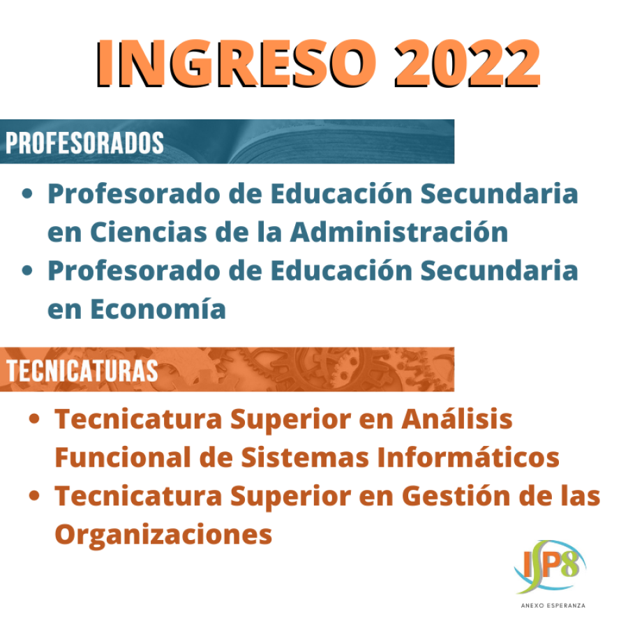 La oferta académica 2022 del Instituto ISP Nº 8 Almirante Brown Anexo Esperanza se compone de los profesorados en Administración y en Economía y las tecnicaturas en Gestión de las Organizaciones y en Análisis Funcional de Sistemas Informáticas. Son carreras de validez nacional, con título oficial.