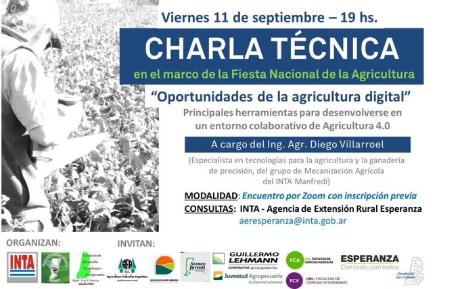 La misma se realizará por una plataforma digital de video conferencias y se titula «Oportunidades de la agricultura digital». El disertante será el Ingeniero Agrónomo Diego Villarroel, especialista en tecnologías para la agricultura y ganadería de precisión, del grupo de mecanización agrícola del INTA Manfredi.