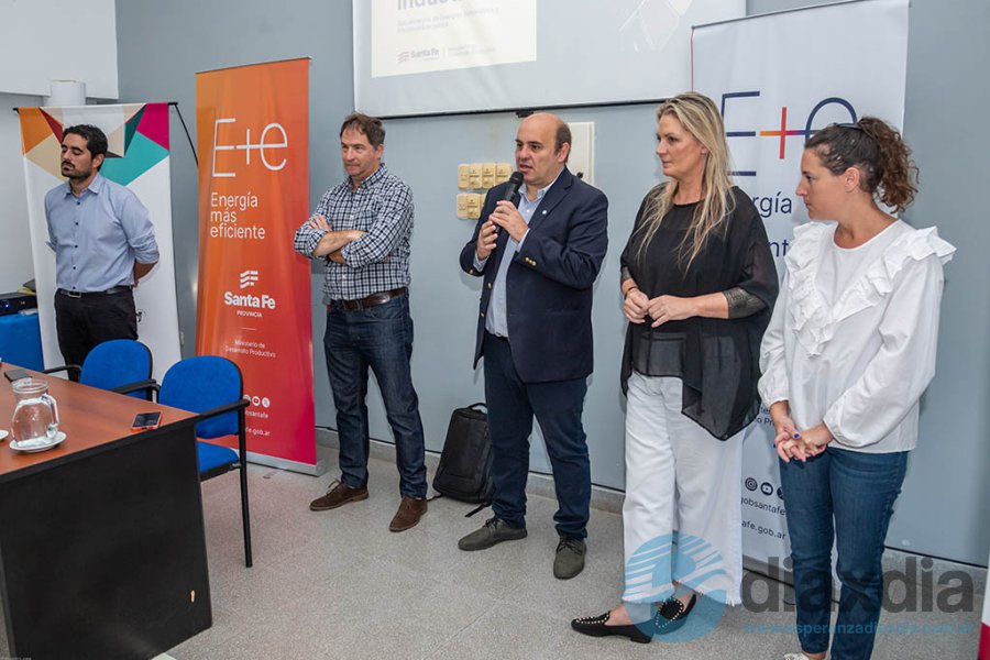 El intendente de Esperanza, Rodrigo Müller, acompañado por la diputada provincial, Jimena Senn, la secretaria de Energía de Santa Fe, Verónica Geese, y la secretaria municipal de Innovación y Desarrollo Económico, María Victoria Nagel, participaron de una charla sobre eficiencia energética para industrias y comercios que se dictó en el Instituto Tecnológico “El Molino”.