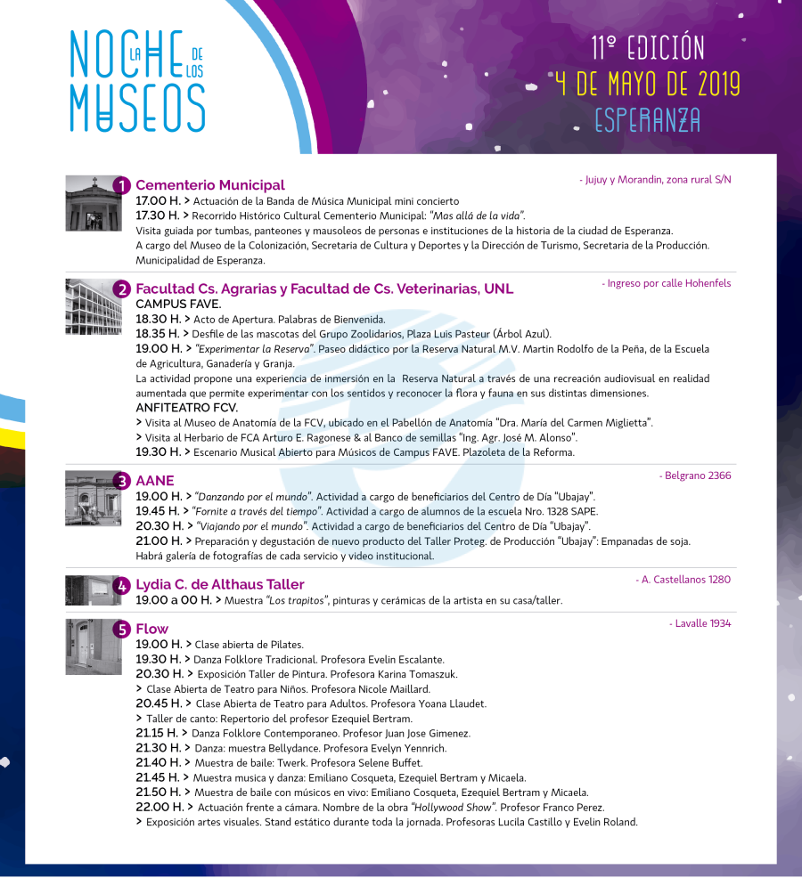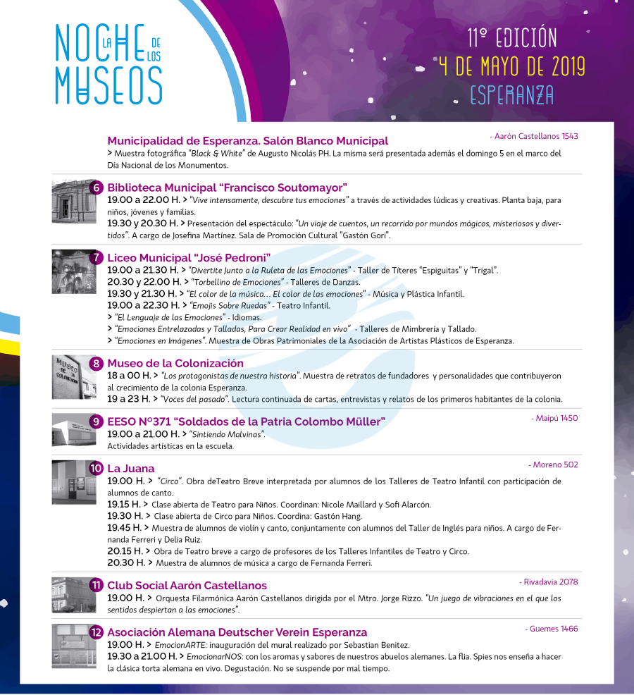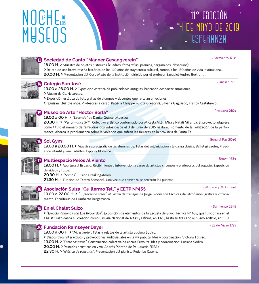 La Noche de los Museos es organizada por Fundación Ramseyer Dayer, la cual de manera estratégica, busca interesar a nuevos públicos que viven en Esperanza y a visitantes de toda la región, a descubrir su vasta y diversa riqueza cultural.