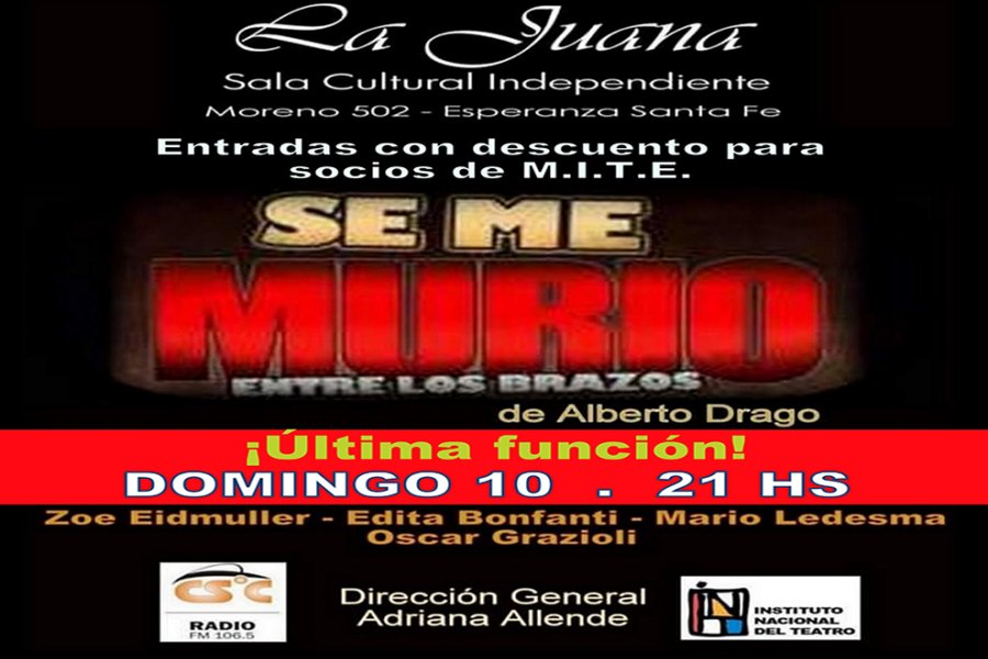 La segunda opción para disfrutar de buen teatro será el domingo, desde las 21 horas, con la reposición y última función del año de “Se me murió entre los brazos”, con elenco conformado por integrantes del Movimiento de Integración de la Tercera Edad (MITE) y La Juana.[{adj:257388 alignleft}]