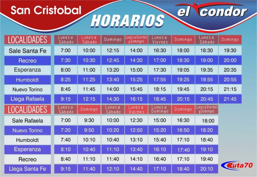 Por su parte la empresa Ruta 70 con sus coches El Cóndor y San Cristobal también aumento desde este lunes 18 la cantidad de servicios a brindar en nuestra región, según los siguientes horarios: