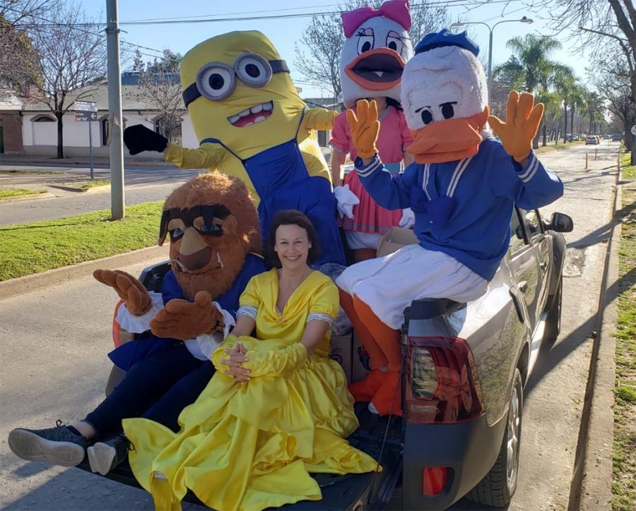 Con personajes infantiles recorrieron las calles de la ciudad y fueron entregando golosinas a los chicos que encontraban en la recorrida.