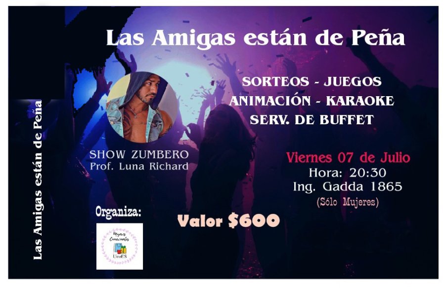 El grupo de mujeres de la Unión de Comerciantes Esperancinos (UCoEs) organiza una Peña de Amigas que se realizará el viernes 7 de julio desde las 20.30 horas en el Club de los Abuelos, en calle Gadda 1865.