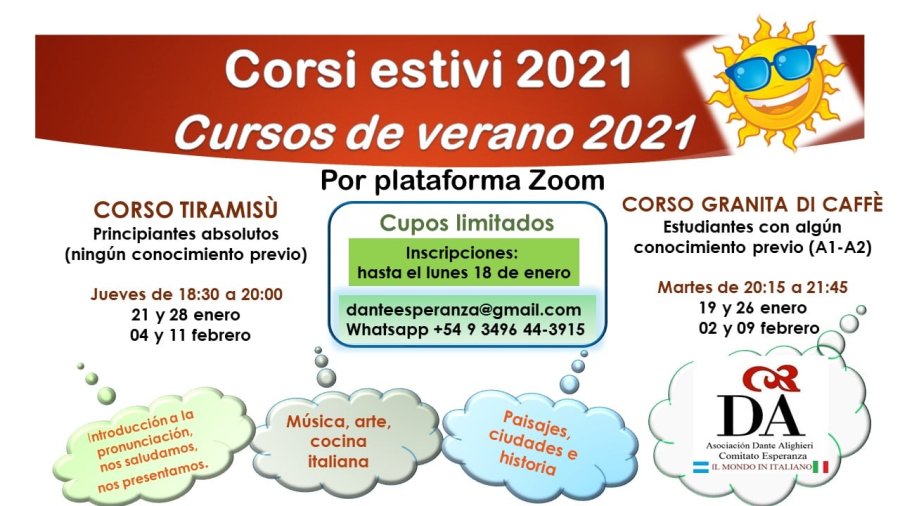La Asociación DANTE ALIGHIERI DE ESPERANZA informa que se encuentran abiertas las inscripciones para los Cursos de Verano, uno orientado a principiantes absolutos y otro a quienes cuentan con conocimiento básico del idioma (nivel A1-A2).