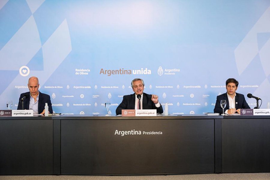 El anuncio comenzó con Fernández, el jefe de Gobierno, Horacio Rodríguez Larreta, y el gobernador bonarense, Axel Kicillof, con una distancia de más de un metro. Luego Fernández anunció que compartiría un video sobre la situación de la pandemia.