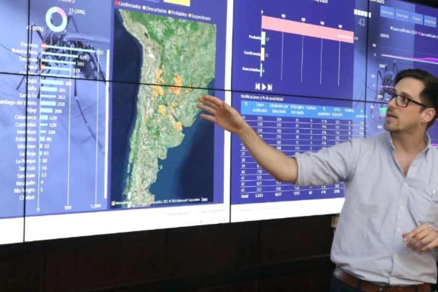 En los hechos, una de las características más impactantes es el enorme tablero donde se vuelcan datos de cada una de las provincias, con casos confirmados y probables, gráficos, mapas y demás recursos visuales e interactivos. Si se buscan imágenes de ese tablero se verá que al frente está el médico infectólogo Mauro Bertolini que integra el staff ministerial desde 2023, es responsable de la Estrategia de dengue y se desempeñó como director de Control de Enfermedades transmitidas por vectores.