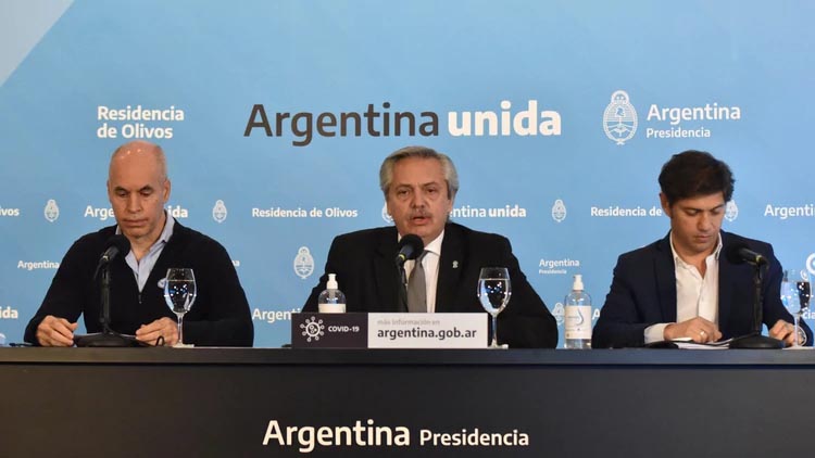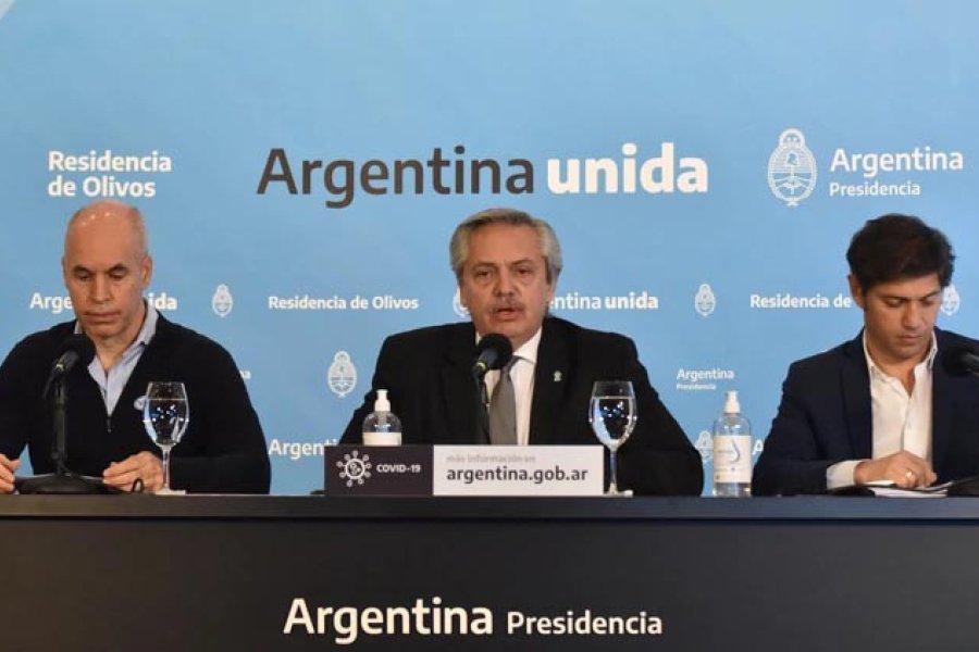 El anuncio se realizó desde la Residencia Presidencial de Olivos, donde Fernández estuvo acompañado por el Jefe de Gobierno de la Ciudad de Buenos Aires, Horacio Rodríguez Larreta, el gobernador de la provincia de Buenos Aires, Axel Kicillof, quienes fueron los encargados de dar a conocer las medidas dispuestas para algunos sectores de las áreas metropolitanas que gobiernan.