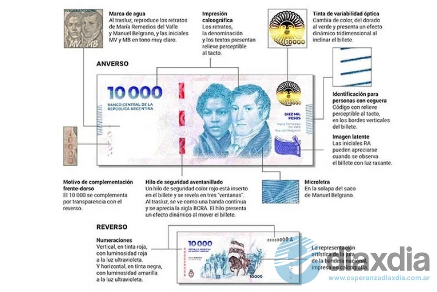 El nuevo billete de $10.000 cuenta con estrictas medidas de seguridad, incorporadas mediante sistemas de impresión especiales. Entre otras, están las siguientes, destinadas principalmente al público en general, pero además permitirá el reconocimiento por máquina: