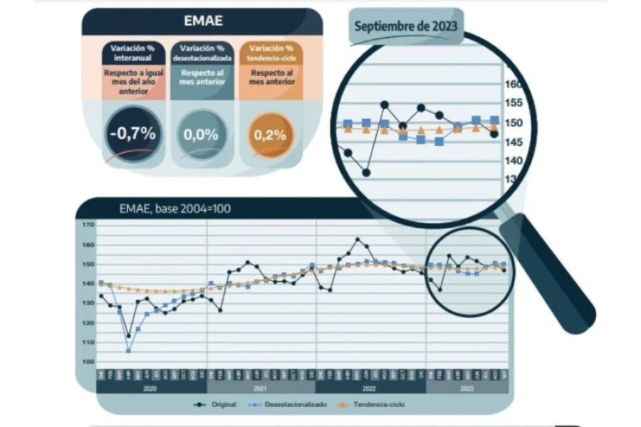 En septiembre pasado, el Estimador Mensual de Actividad Económica (EMAE) registró una caída de 0,7% en la comparación interanual y se mantuvo sin variación respecto a agosto en la medición desestacionalizada, informó el Instituto Nacional de Estadísticas y Censos (INDEC).