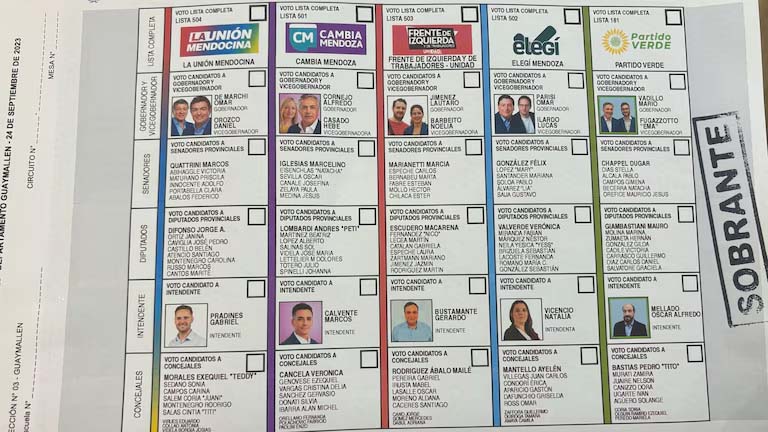 El modelo mendocino, que el Senado tomó como referencia cuando modificó el texto que se había aprobado en Diputados (inspirado en el modelo de la provincia de Córdoba), ubica los cargos sobre el margen izquierdo de manera horizontal y los partidos o alianzas en filas verticales con diferentes colores.