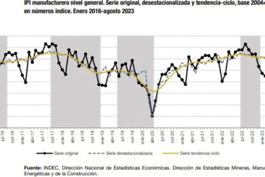 "En agosto de 2023, once de las dieciséis divisiones de la industria manufacturera presentaron caídas interanuales". En orden a su incidencia en el nivel general, se registraron caídas en "Alimentos y bebidas", 7,3%; "Industrias metálicas básicas", 7,4%; "Sustancias y productos químicos", 3,4%; "Refinación del petróleo, coque y combustible nuclear", 6,7%; "Productos textiles", 5,1%.