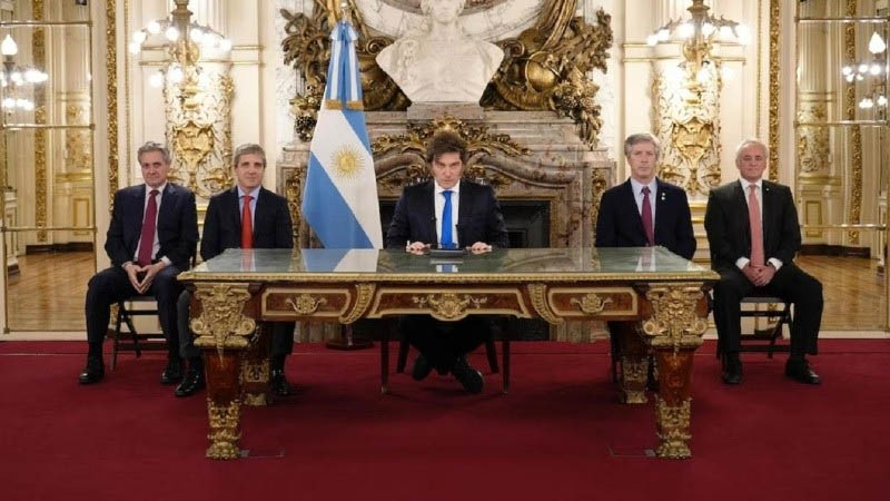 El presidente apareció rodeado junto al ministro de Economía, Luis Caputo, el viceministro de Economía, José Luis Daza, el titular del Banco Central, Santiago Bausili, y el vice del BCRA, Vladímir Werning.