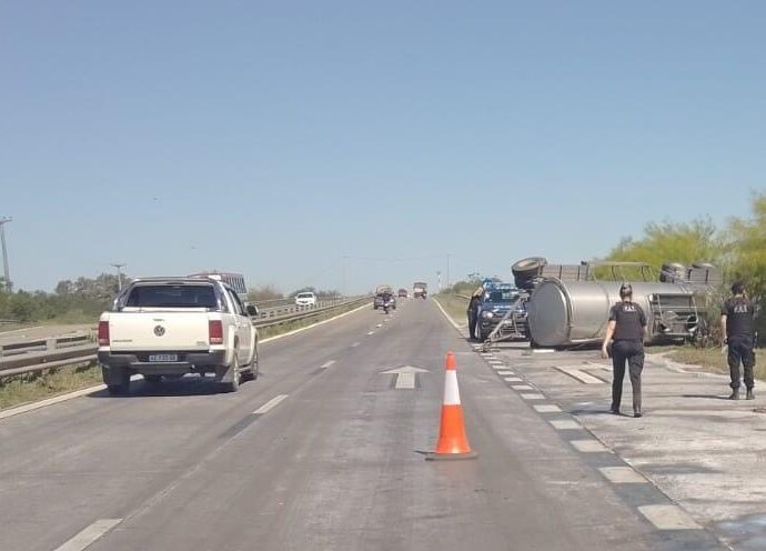 El tránsito permaneció con demoras ya que el acoplado quedó en parte de la cinta asfáltica, la unidad tractora dentro del pastizal que está ´por fuera del guardar raid.