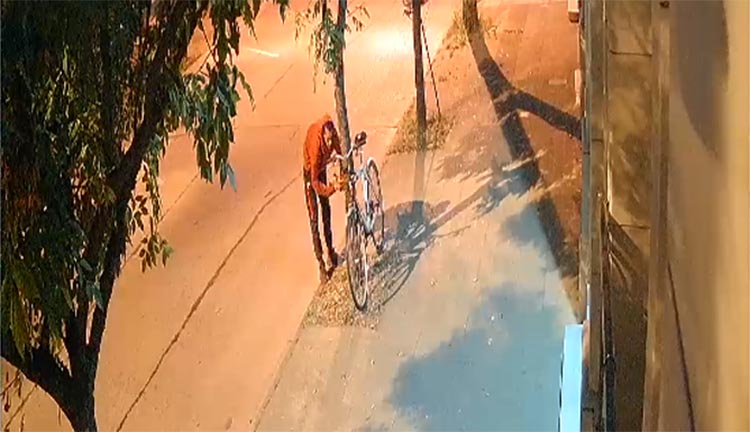 Mostramos aquí como un ladrón en sólo 25 segundos violenta una cadena que "aseguraba" una bicicleta y se la lleva. Llega corriendo con una herramienta para romper la cadena. En pocos segundos deja caer su capucha, pero vuelve a ocultarse.
