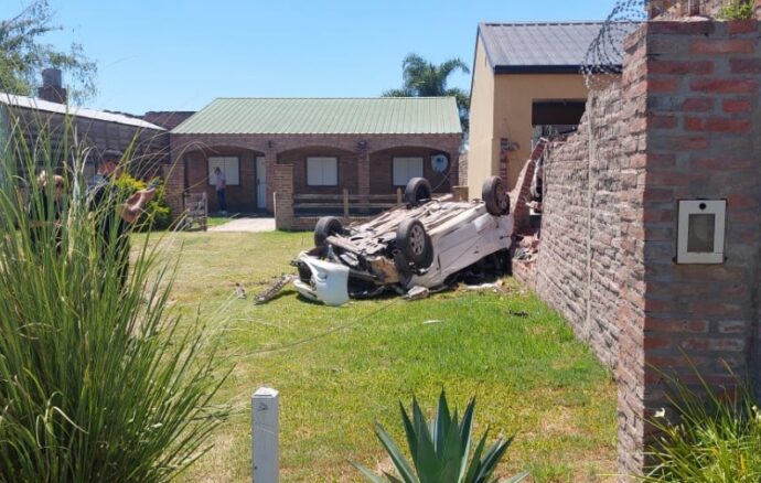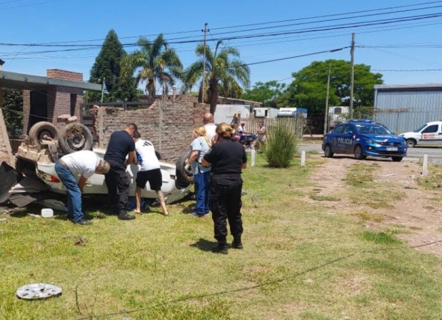 Minutos antes al mediodía ocurrió un siniestro vial en zona sur de Recreo. La conductora tras perder el control del auto impactó contra una vivienda y volcó. Quedó atrapada hasta la llegada de los servicios de emergencias y vecinos que colaboraron.