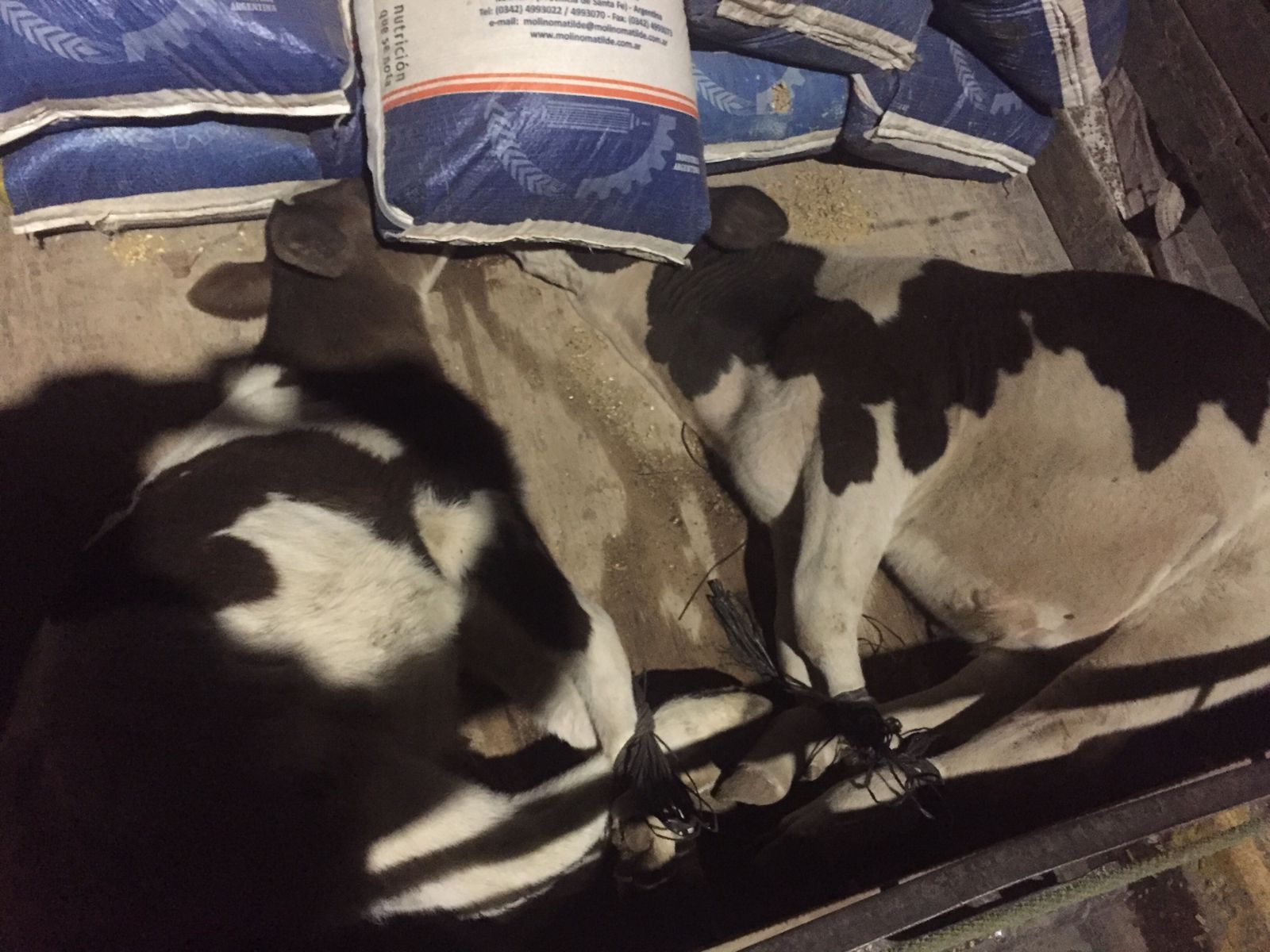 Al realizar la verificación del vehículo se encontró que en la parte trasera llevaban varias bolsas de alimento para ganado como así también dos terneros vivos, de pelaje Holando, no pudiendo justificar su procedencia.
