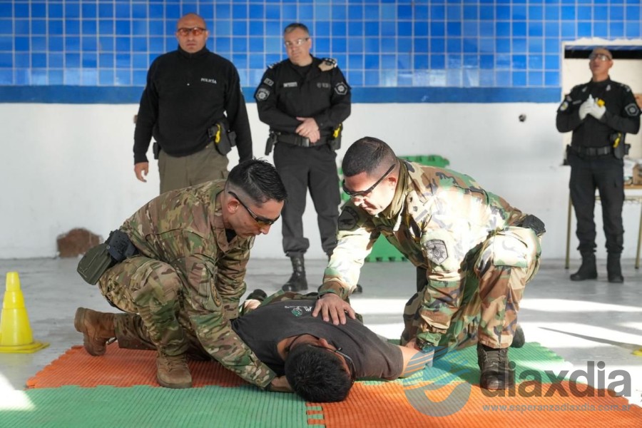 El entrenamiento cuenta con un protocolo de seguridad dividido en dos áreas: una línea segura, para observadores y el personal que recibirá la descarga, y una zona de práctica, marcada con tatamis, donde el operador despliega el arma.