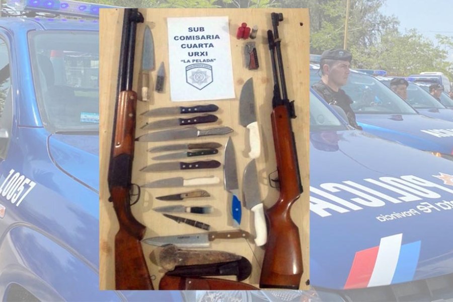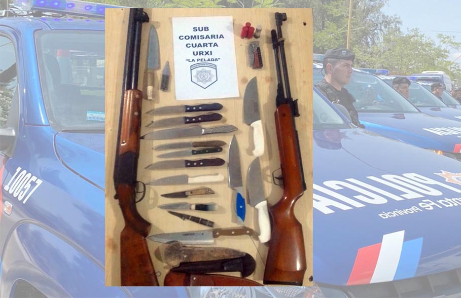Una vecina de la localidad de La Pelada le solicitó ayuda al personal policial que se encontraba realizando patrullajes preventivos durante la medianoche del viernes, debido a que en un domicilio se estaba desarrollando una fuerte discusión familiar. Rápidamente en el lugar, los uniformados, determinaron que uno de los involucrados en la discusión, se encontraba muy exaltado y establecieron además que habría armas en el domicilio por lo cual realizaron una requisa domiciliaria, encontrando una escopeta sin Tenencia legal de Arma de Fuego de Uso Civil, un aire comprimido y armas blancas de diferentes tamaños y características.
