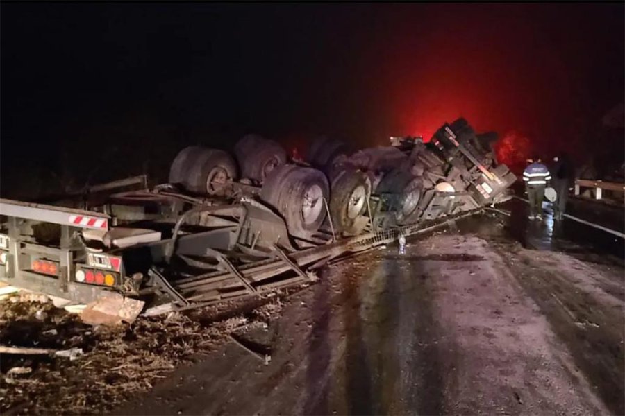 Las primeras imágenes que trascendieron luego de lo ocurrido dan cuenta de cómo la cabina del camión quedó parcialmente dada vuelta sobre el asfalto, en tanto que el acoplado se volteó por completo y provocó la destrucción de la mercadería.