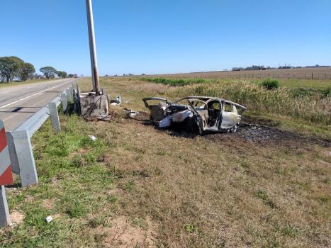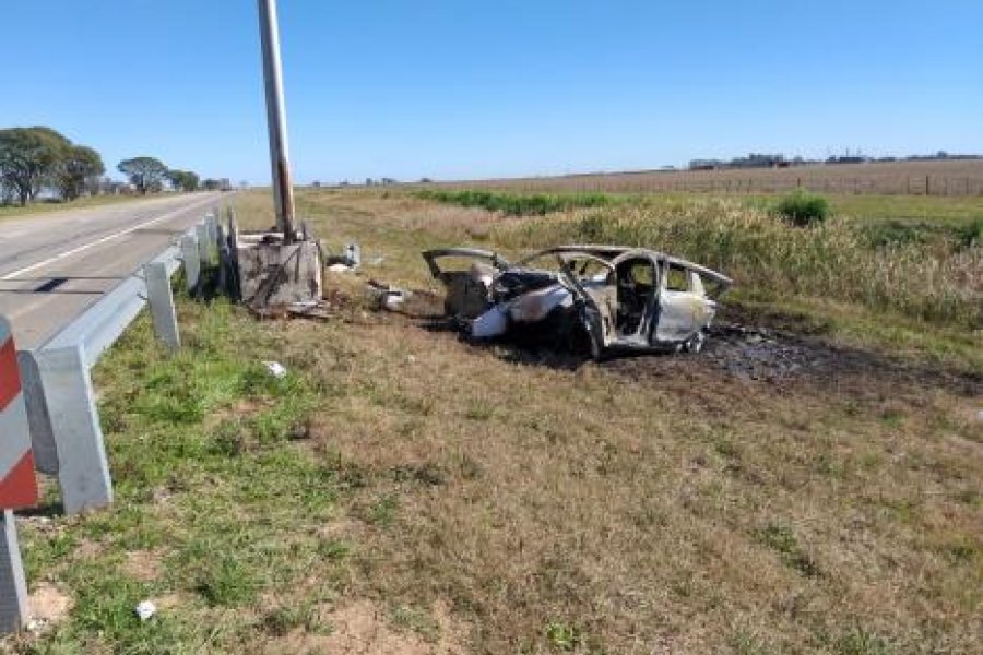 Fue en el km 92, a 400 metros del acceso a la localidad de Clucellas, intersección con la ruta provincial 13, donde un Renault Sandero embistió un pórtico de metal conteniendo la cartelería, lo que provocó un incendio en el automóvil.