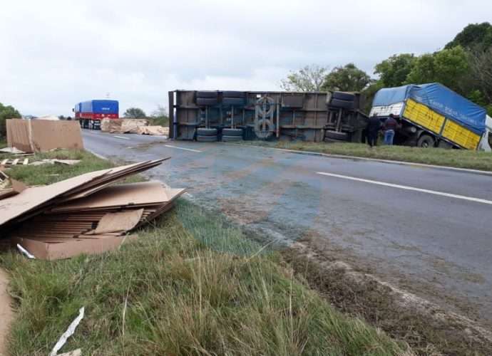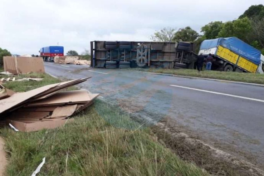 Por causas que se tratan de establecer el vehículo de gran porte pierde el control y termina volcando su acoplado y el tractor dentro de un zajón.