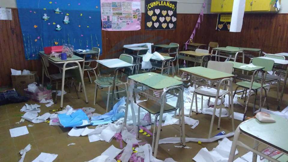 Puntualizó que “sacaron cosas de los armarios, desparramaron y rompieron juegos didácticos de los chicos que se usan para las clase so el recreo, destrozaron material de los maestros y alumnos, pisotearon trabajos, desparramaron rollos de cocina y papel higiénico, hicieron un bollo con papeles y cintas y lo subieron al extremo superior del mástil”.
