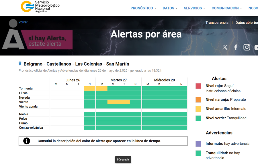Según se informó pasadas las 18 de este lunes, “el área será afectada por lluvias y tormentas de variada intensidad, por momentos localmente fuertes. Se espera que las mismas estén acompañadas por actividad eléctrica, caída de granizo, abundante caída de agua en cortos períodos y ráfagas que podrían superar los 70 km/h. Se esperan valores de precipitación acumulada entre 30 y 70 mm, pudiendo ser superados de forma puntual”.