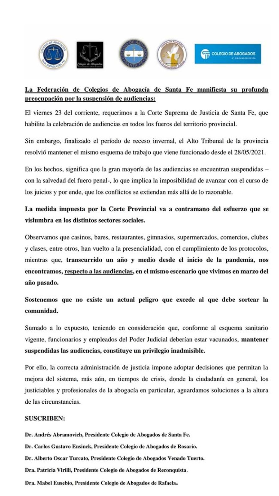 En consecuencia, los Colegios de Abogados de la provincia pidieron la normalización de las audiencias presenciales a partir de la finalización del feria judicial invernal. Esta solicitud fue firmada por las entidades de la ciudad de Santa Fe, Rosario, Reconquista, Rafaela y Venado Tuerto.