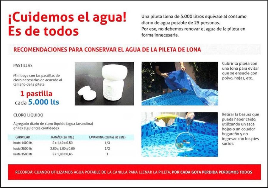 - Agregar al agua de la pileta hipoclorito de sodio (lavandina) o una una pastilla de cloro sólido para conservarla varios días.