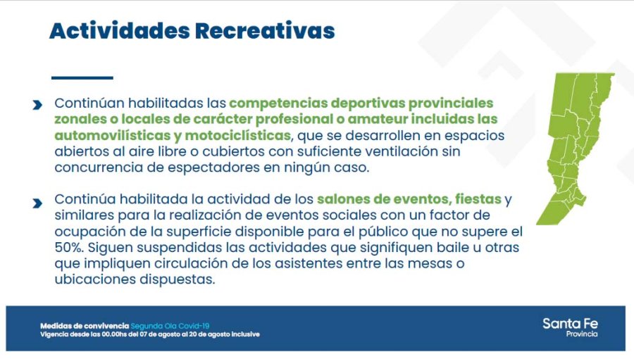 En el marco de la pandemia del Covid-19, el gobierno de la provincia de Santa Fe dio a conocer las nuevas medidas de convivencia que regirán en todo el territorio desde la 0 hora del día 7 y hasta el 20 de agosto de 2021 inclusive.