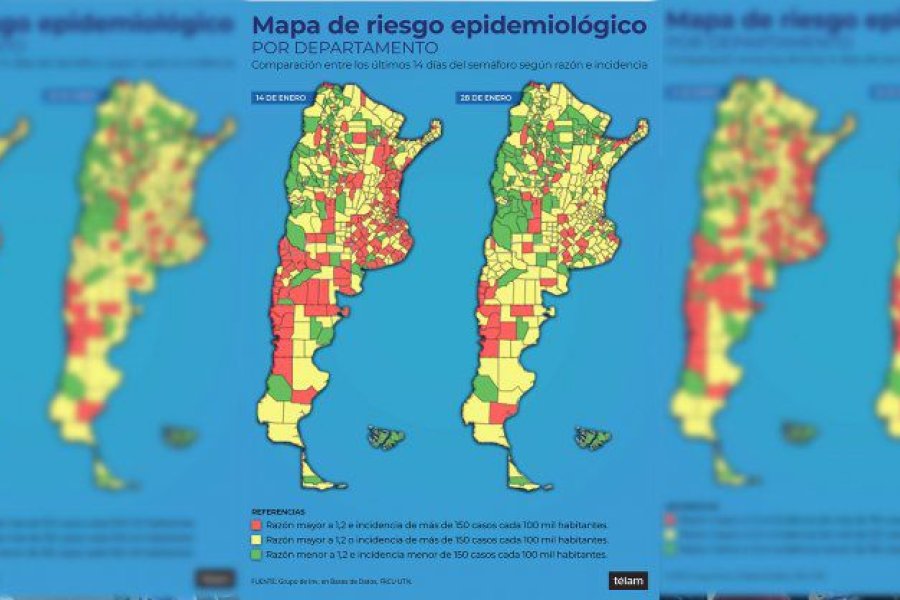 Según publica la agencia oficial de noticias Télam, unos 295 Departamentos, casi la mitad del país, se presenta en amarillo (cifra que creció en relación a los 14 días previos, en los que el riesgo medio representaba sólo el 41% -con 208 Departamentos-); en tanto que en riesgo bajo hay actualmente 136 (27%) contra 89 que había 14 días atrás (que representaban el 17%).