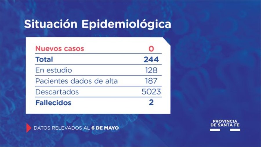 El Ministerio de Salud de Santa Fe, a través de la Dirección Provincial de Epidemiología, informa a la población que a la fecha no se ha confirmado casos nuevos de COVID-19, con residencia en el territorio provincial.