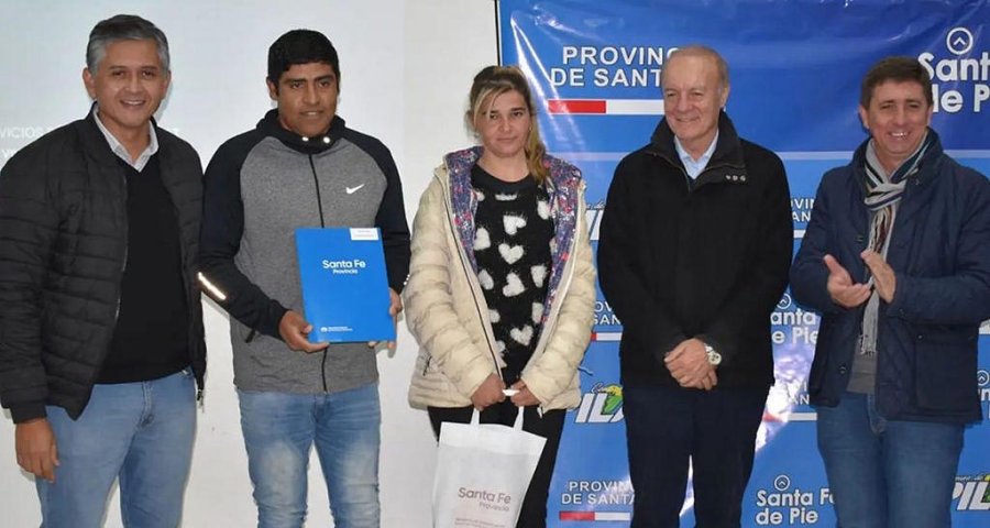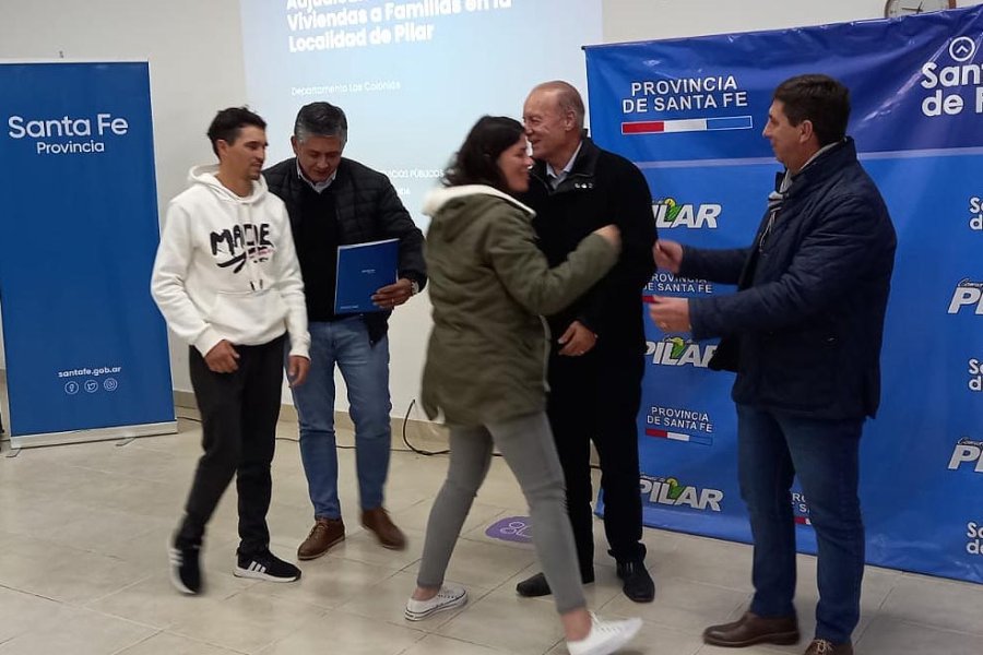 El presidente comunal de Pilar, Diego Vargas, junto al secretario de Hábitat, Urbanismo y Vivienda de la provincia de Santa Fe, Amado Zorzón, y el Senador departamental por el departamento Las Colonias, Rubén Pirola, hicieron entrega de cuatro viviendas y la licitación de tres nuevas, gestionadas bajo el Programa provincial “Lote Propio”.