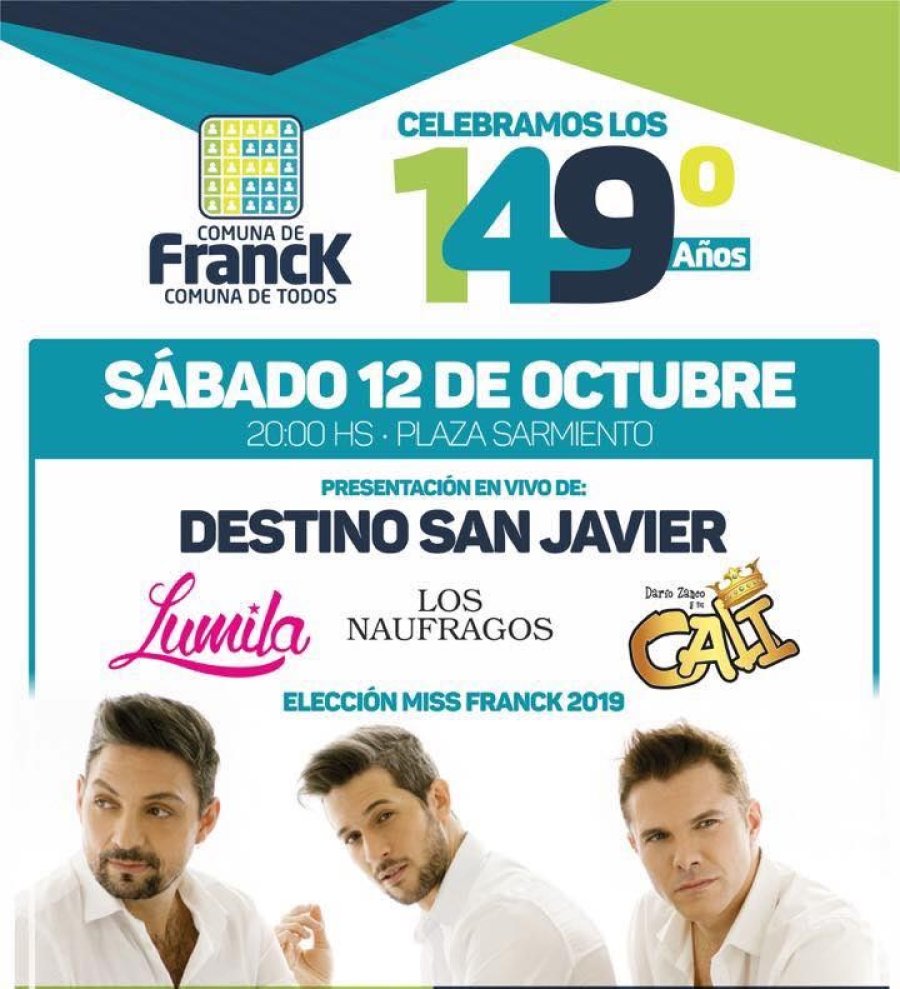 El SÁBADO 12 DE OCTUBRE, la plaza Sarmiento se vestirá de fiesta para los festejos centrales. Franck y la región disfrutarán de la presentación en vivo de la artista local "Lumila", y de canciones del recuerdo con el show de "Los Náufragos."