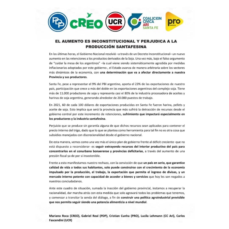 Además, en el marco de las medidas impulsadas por el oficialismo, los partidos opositores de Santa Fe (Creo, Coalición Cívica, PDP, PRO y UCR) coincidieron en la firma de un documento conjunto para rechazar el aumento de las retenciones a las exportaciones de harina y aceites de soja, en el que indicaron que este aumento "es inconstitucional y perjudica a la producción santafesina".