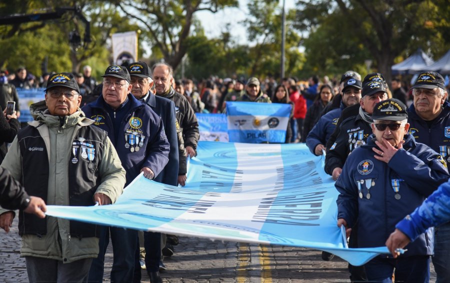 El acto contó con la presencia de hijas e hijos de ex soldados combatientes en Malvinas, que portaron la bandera nacional hasta el mástil. El tradicional desfile era protagonizado por más de 1.200 ex combatientes de todo el país que llegaron a Rosario en el marco de los 40 años de la Gesta de Malvinas, y quienes realizaron la reafirmación de la jura a la Bandera, y recibieron diplomas.