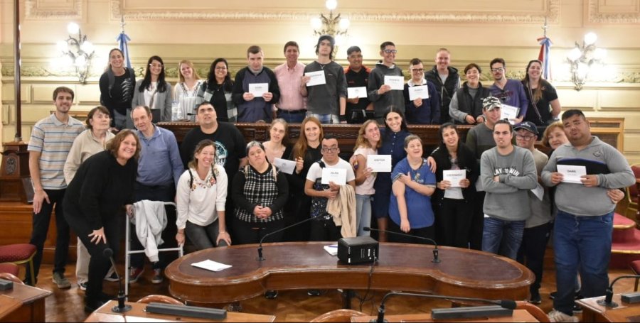 Con los alumnos del Centro de Día Enredes de San Jerónimo Norte compartió una nueva experiencia al recibirlos en el recinto de la Cámara Alta y junto a vecinos e integrantes de instituciones de María Luisa compartió el acto de celebración de su 140 aniversario.