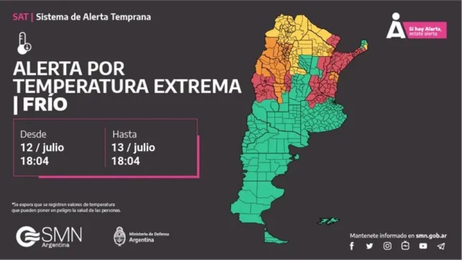 Tras una jornada en la que el sol brilló con todo su esplendor y elevó un poco la temperatura, el Servicio Meteorológico Nacional (SMN) renovó la advertencia minutos después de las 18, por lo que la capital provincial y la región continúan dentro de las zonas afectadas por la ola polar.