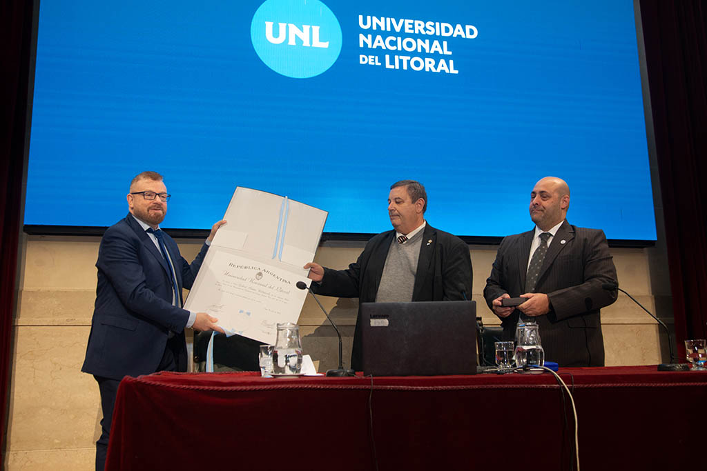 En un acto realizado en el Paraninfo de la Universidad Nacional del Litoral el prestigioso investigador Gabriel Rabinovich recibió esta mañana la máxima distinción otorgada por la casa de estudios: el título de Doctor Honoris Causa por su importante aporte a los estudios sobre galectinas, cáncer e inmunología.