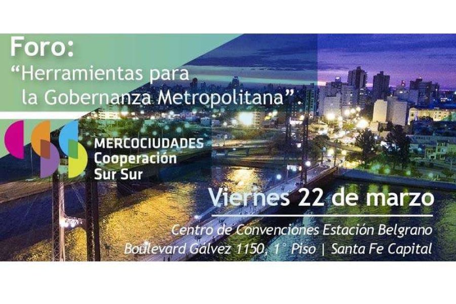 Impulsado por el Ente Coordinador del Área Metropolitana (ECAM), la Municipalidad de Santa Fe, la UNL, la Municipalidad de Córdoba, la Municipalidad de Tandil y la Municipalidad de Avellaneda, se llevará a cabo en la ciudad capital un “Foro sobre Herramientas para la Gobernanza Metropolitana”, en el marco del proyecto: “Áreas Metropolitanas: desafíos para su consolidación en un marco de gobernanza” - Convocatoria a financiamiento del Programa de Cooperación Sur-Sur de Mercociudades.