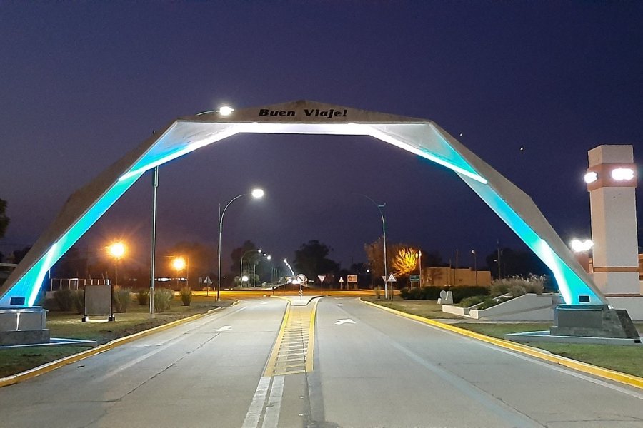 Anoche el pórtico de ingreso a la segunda ciudad de Las Colonias estaba iluminado con los colores de la bandera nacional.