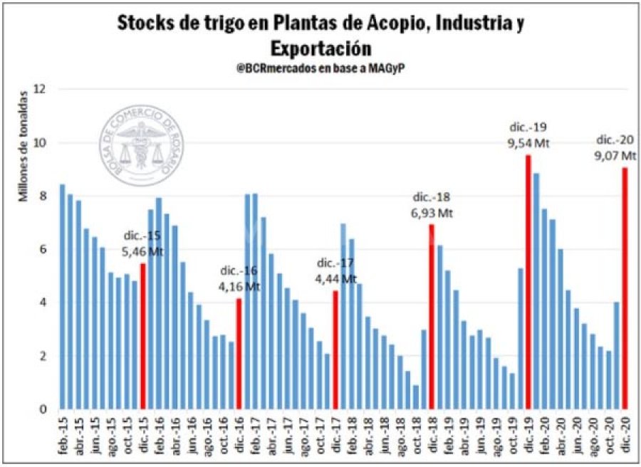 Con la entrada de la nueva cosecha de trigo, se reestablecieron fuertemente stocks en el mes de diciembre, considerando el cereal en manos de Plantas de Acopio, Industria y Exportación al último día del mes. Los stocks alcanzaron 9.066.073 toneladas, subiendo 125% (algo más de 5 millones de toneladas) en relación con el mes de noviembre.