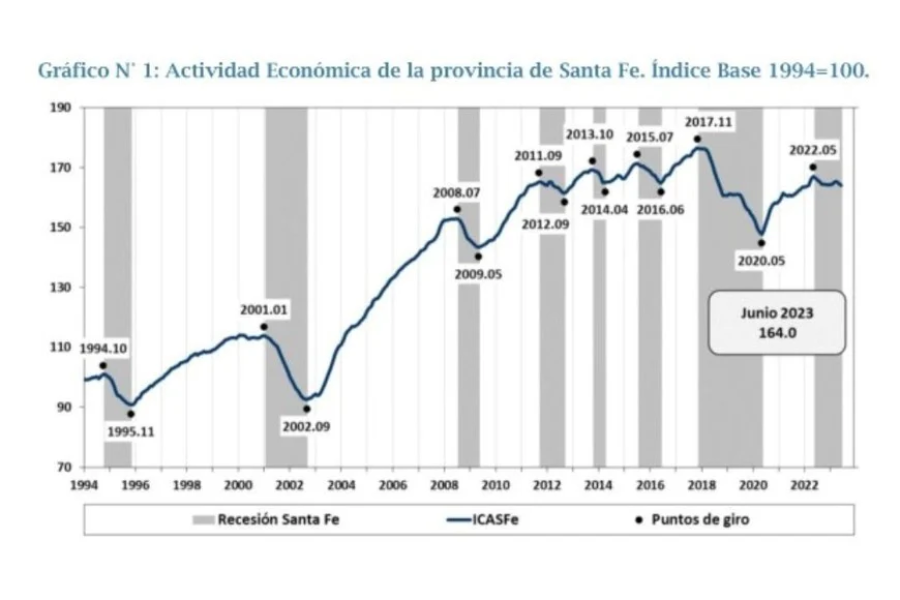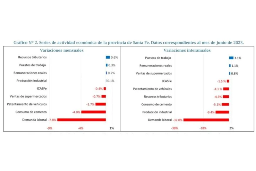 "En junio de 2023 el peso de las series cuyas variaciones mensuales fueron negativas predominó tanto en el cuadro de variaciones mensuales como interanuales", advirtió la última edición del Índice Compuesto de la Actividad Económica de Santa Fe.